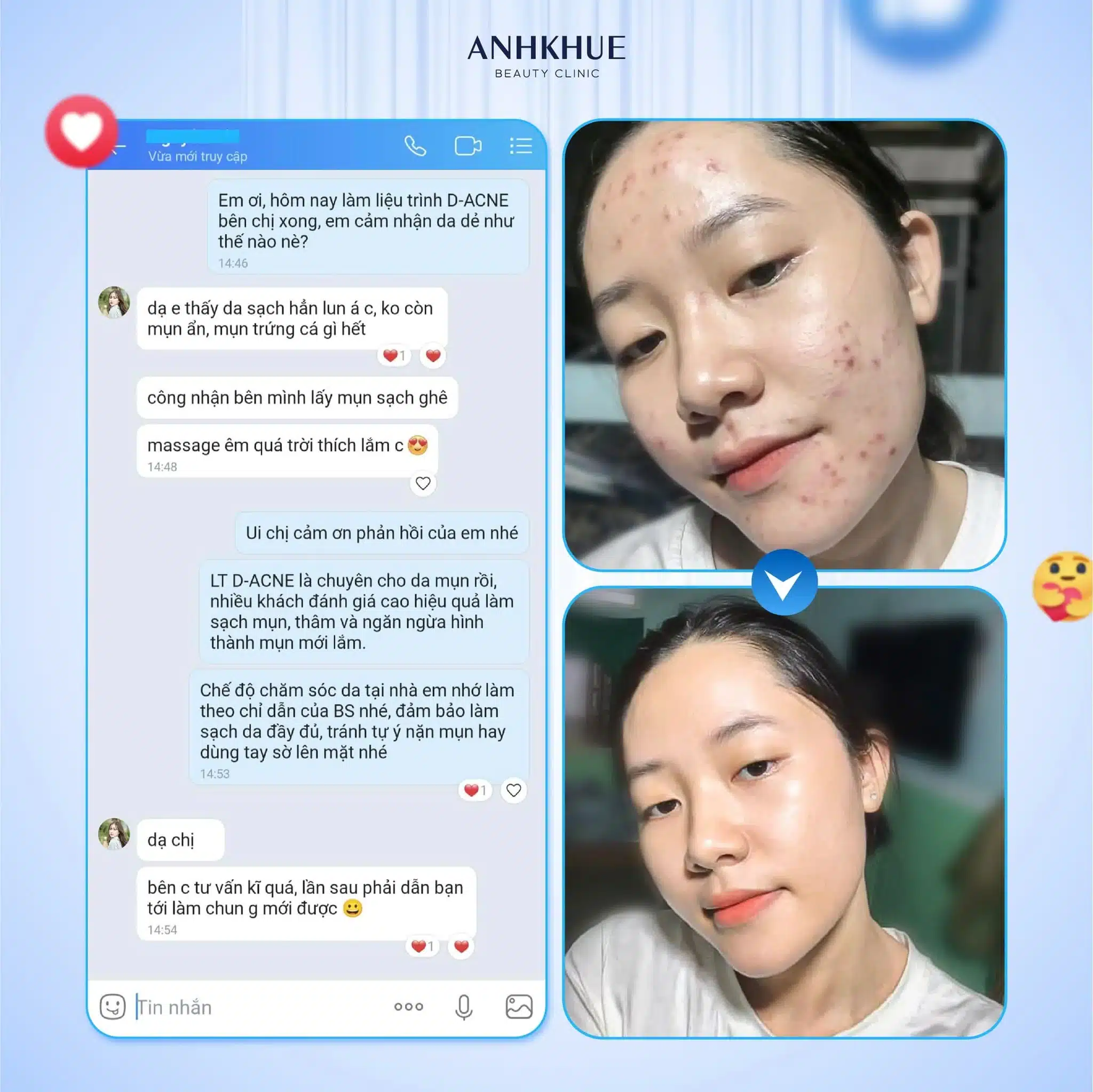 Phải công nhận Combo D-ACNE đang là dịch vụ được nhiều khách hàng ưa chuộng tại Anh Khuê Beauty Clinic. Nhờ việc kết hợp 3 liệu trình trị mụn chuyên sâu gồm Acneskin + IPL + Laser, Combo D-Acne cho hiệu quả làm sạch mụn tối ưu, làm mờ thâm nám, sẹo mụn, ngăn ngừa mụn tái phát.